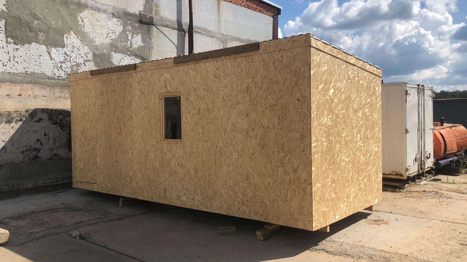 Бытовка в базовой комплектации: каркасная конструкция с внешней обшивкой из ОСБ-плит, обеспечивающих повышенную жёсткость и влагостойкость