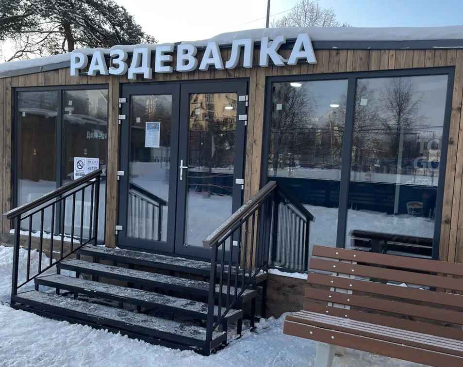Здание раздевалки у катка, на металлическом каркасе, внешняя отделка деревом, панорамные окна
